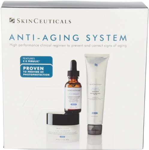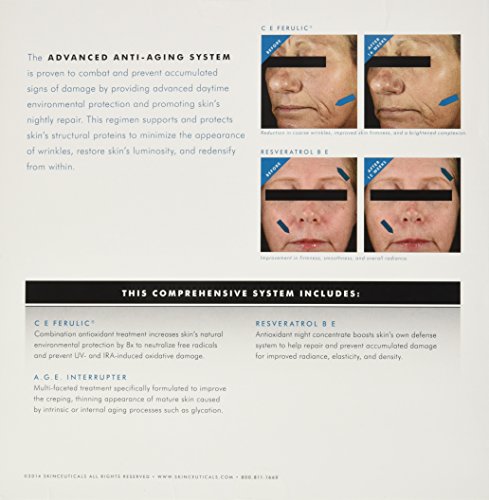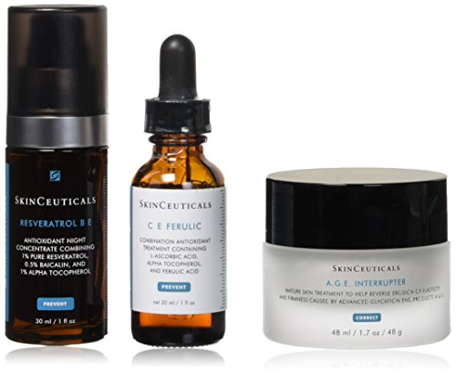 A three product high performance day & night clinical regimen to help fight and improve the appearance of advanced signs of aging. C E FERULIC 1oz. is a combination antioxidant delivers advanced environment protection by neutralizing free radicals that cause the appearance of accelerated skin aging. Proven to visibly improve the look of wrinkles and skin's firmness. A.G.E. INTERRUPTER 1.7oz. is specifically formulated to improve the thinning appearance of mature skin. Proven to significantly improve skin's elasticity and reduce the appearance of wrinkles by 20%. RESVERATROL B E 1oz. a night antioxidant concentrate to help boost skin’s own defense system to help improve the appearance of accumulated damage. Proven to statistically improve skin's radiance.Feature