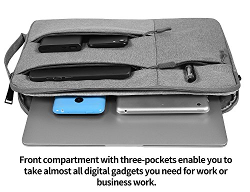 FRONT THREE POCKETS STORAGE & DURABLE ZIPPER - Three pockets in front, enough space to keeping, mouse, cable, cellphone, memory cards, external hard drive, pens etc. Top-loading zipper on the sleeve glides smoothly and allows convenient access to your laptop