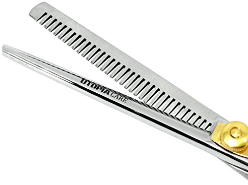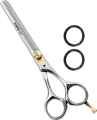 Blades are convex hollow ground with improved razor edge retention; thinning contains teeth on one blade and a smooth razor edge on second; includes removable rubber handle inserts to fit any thumb and finger