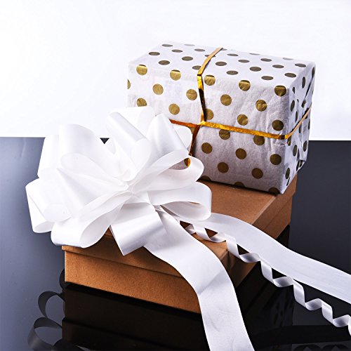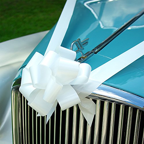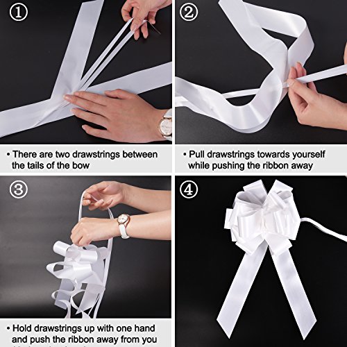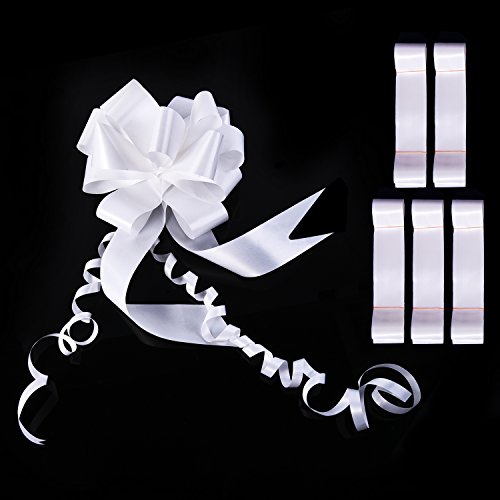 Features: Pull bows set: Come in flat ribbons. Glossy and smooth flat pull bows can be fold to store, will not take up much spaces, you can use them whenever you want. Easy to do: To form your bow, just hold the two strings of the flat ribbon bow and push up with your thumb and fore finger, and you can curl the strings gently with scissors for additional usage. Wide application: Large pull bows are suitable for wedding car decoration, gift wrapping, venue decoration, pew ends or reception chair backs, party tables, etc., you can apply them to wrap present boxes for your family, friends on holidays, memorial days, suitable for medium and big objects. Specifications: Color: white Flat size(WL): approx. 45 mm x 150 cm Pulled diameter: approx. 17 cm/ 6.7 inches Material: OPP film Quantity: 6 pack Package includes: 6 x Pull bows Note: Winding risk, not suitable for children. Adult supervision is required. Once you form the bow, the two long strings are still there, curl the strings for additional decorating effect. 0