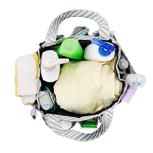 - Portable bathroom tote. Hanging shower tote caddy over the door, showerhead or put it on a shower stand in the corner. Perfect college dorm shower caddy for camp, travel, gym, swimming.