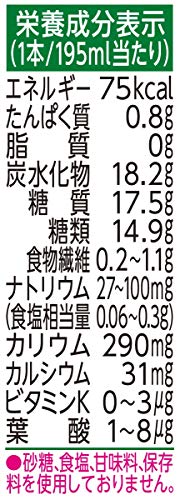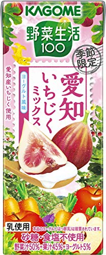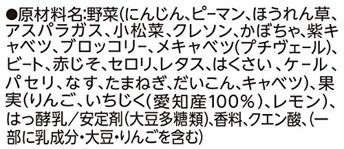 原材料:野菜(にんじん、ピーマン、ほうれん草、アスパラガス、小松菜、クレソン、かぼちゃ、紫キャベツ、ブロッコリー、メキャベツ(プチヴェール)、ビート、赤じそ、セロリ、レタス、はくさい、ケール、パセリ、なす、たまねぎ、だいこん、キャベツ)、果実(りんご、いちじく(愛知産100%)、レモン)、はっ酵乳/安定剤(大豆多糖類)、香料、クエン酸、(一部に乳成分・大豆・りんごを含む)