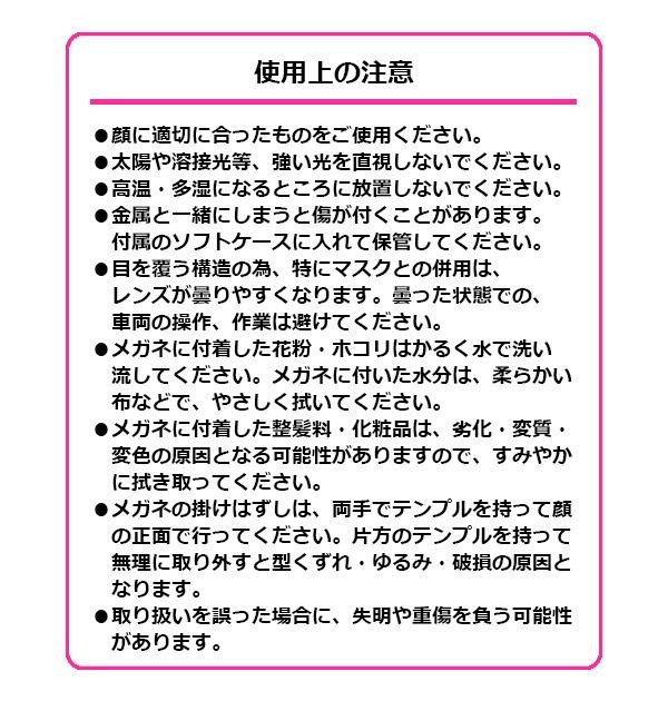 | 素材・材質 | レンズ:プラスチック(コーティング) フレーム:TR90、プラスチック(塗装) ソフトケース:ポリエステル |
