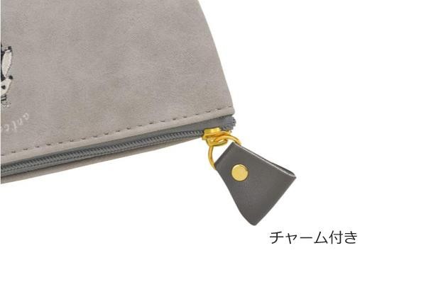 ゆるくて楽しい雰囲気の、ユニークなキャラクターの刺繍がかわいいポーチです。頭のパーティー帽子をイメージした、三角のチャームがアクセントになっています。四角い形と幅広のマチでたっぷり大容量なので、メイクポーチなどに使っても取り出しやすくおすすめです。 |