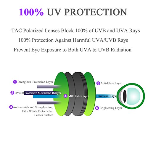 100% UV400 Protection --- TAC Polarized Lenses block 100% of harmful UVA & UVB Rays. Restore true color, eliminate reflected light and scattered light and protect eyes perfectly.