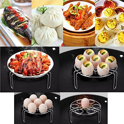 *Cooks your food with steamer rack can retains more vitamins, flavors, nutrients and texture than boiling, microwaving and frying method. *If you have a baby, the steamer rack is perfect for steaming fruit and vegetables for making baby food. *Easy to Use Seven-hole design, placed solid, enjoy the convenience of simple life. *Great for making boiled eggs,conveniently cooks 1 to 7 eggs in a few minutes. *Multi-fuction use, you can also use it as steam rack, cooling rack, pot stand rack and so on. *The steamer rack is used for kind of foods: - Fruit and Vegetables - Seafood (i.e fish, crab, mussels, clams) - Desserts - Dumplings - Meat and Chicken - Boiling Eggs Rise - Eggs and more...