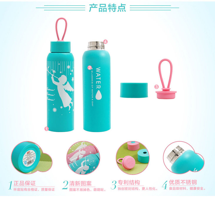 | Product Description | Our life Vogue angel mug 340ml, colors, find your own mood, a veritable Meng Meng cup interpretation cute fashion style, made of stainless steel interior design, warm and long-time cold and easy to clean, stainless steel as a material, cup imported pearlescent paint surface, high temperature resistant PP material sealed lid bottom of the cup made of imported raw materials paint, wear durability, safety dense ring sealing, capping the use of food-grade refractory materials, environmental safety and health, there are food grade lid leak-proof silicone, frosted mug with the top paint technology, was noble and generous, beautiful color, comfortable, beautiful, durable, wear-resistant, stainless steel cup body can be used as a small gift to send a loved one, warm the truth, a long long time - · ~ ...... high-grade, low-cost office partner, out partner, good friend in life, a "cup" child warmth. |