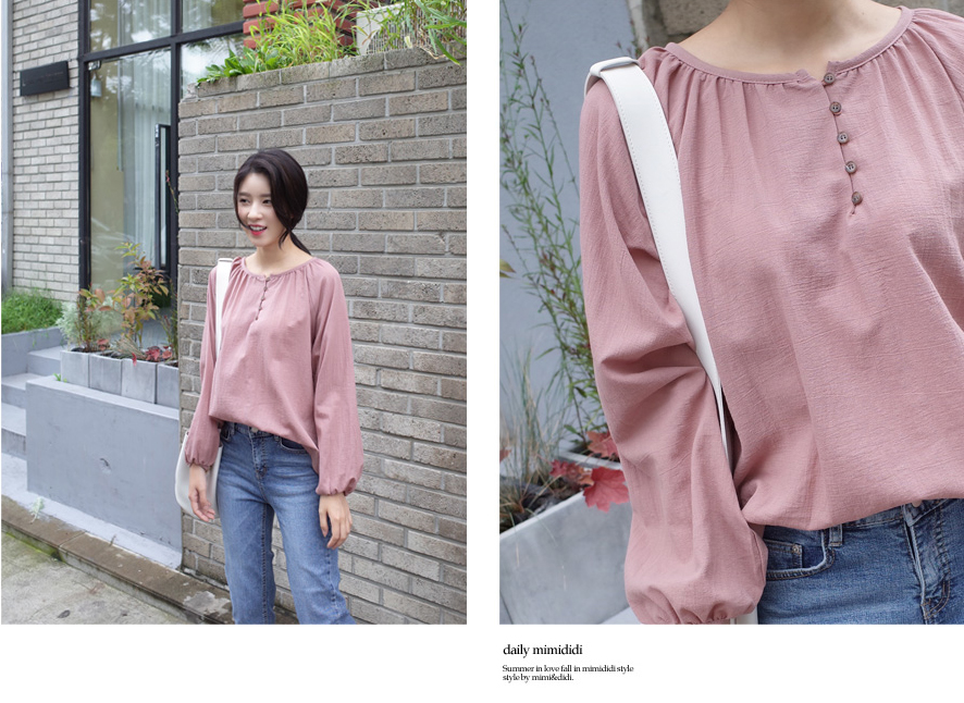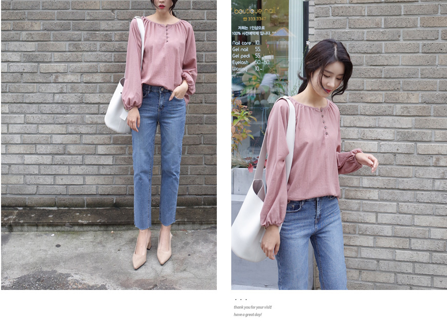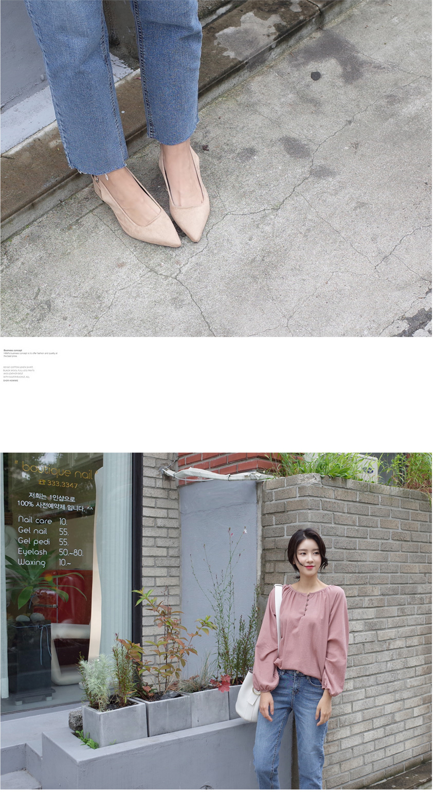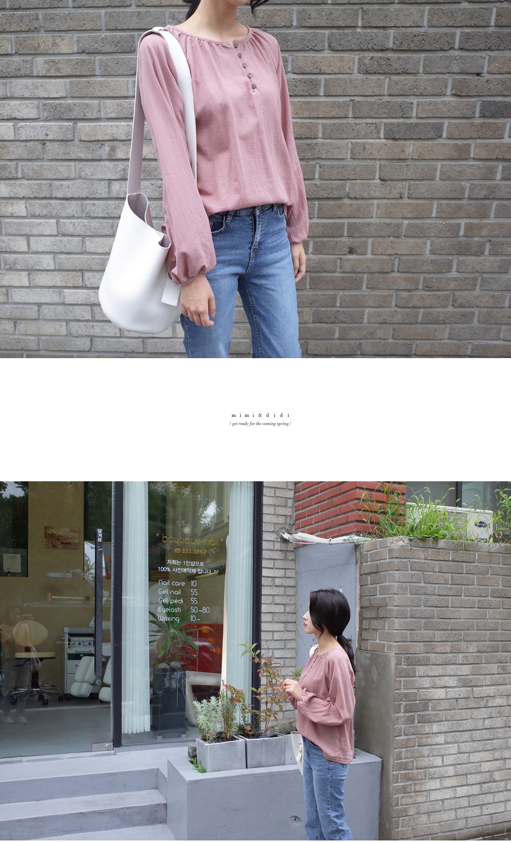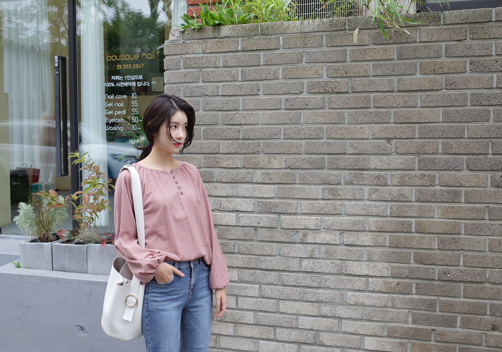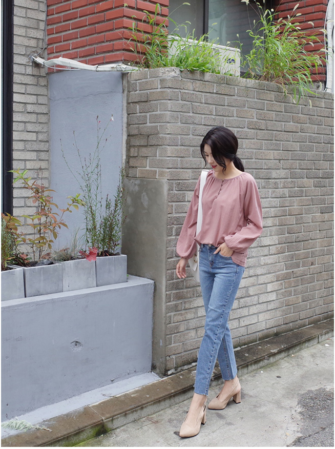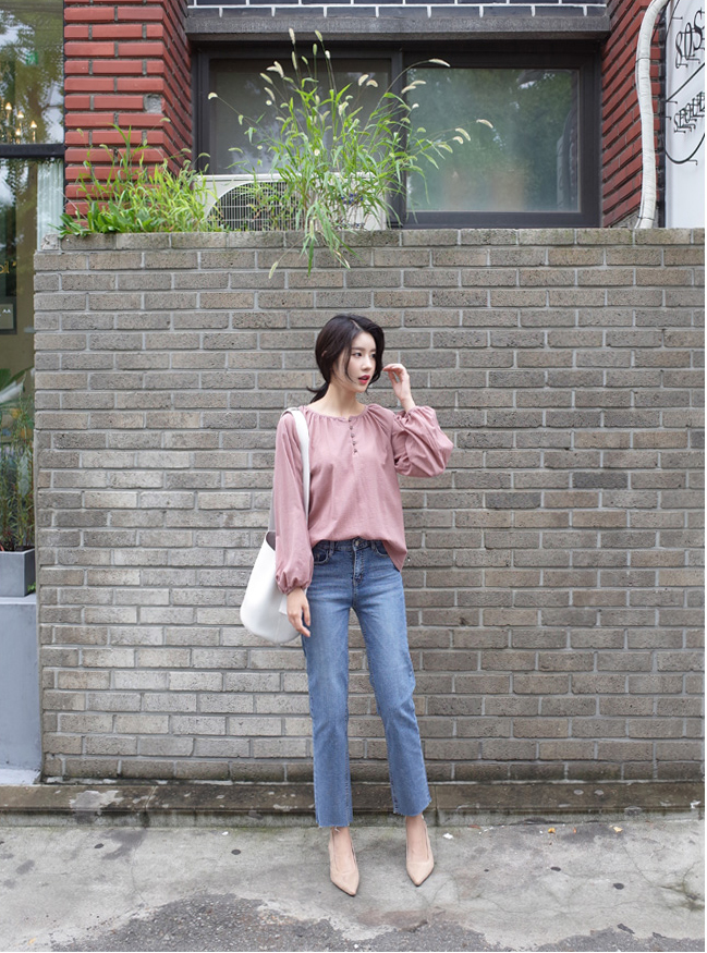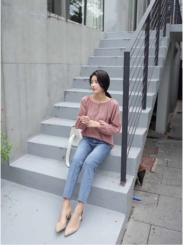넥라인의 단추가 포인트가 되어주는 러블리한