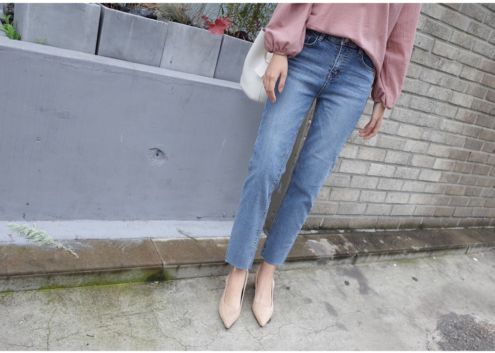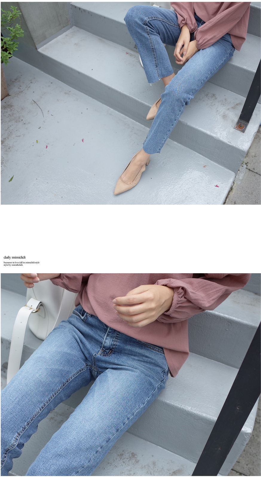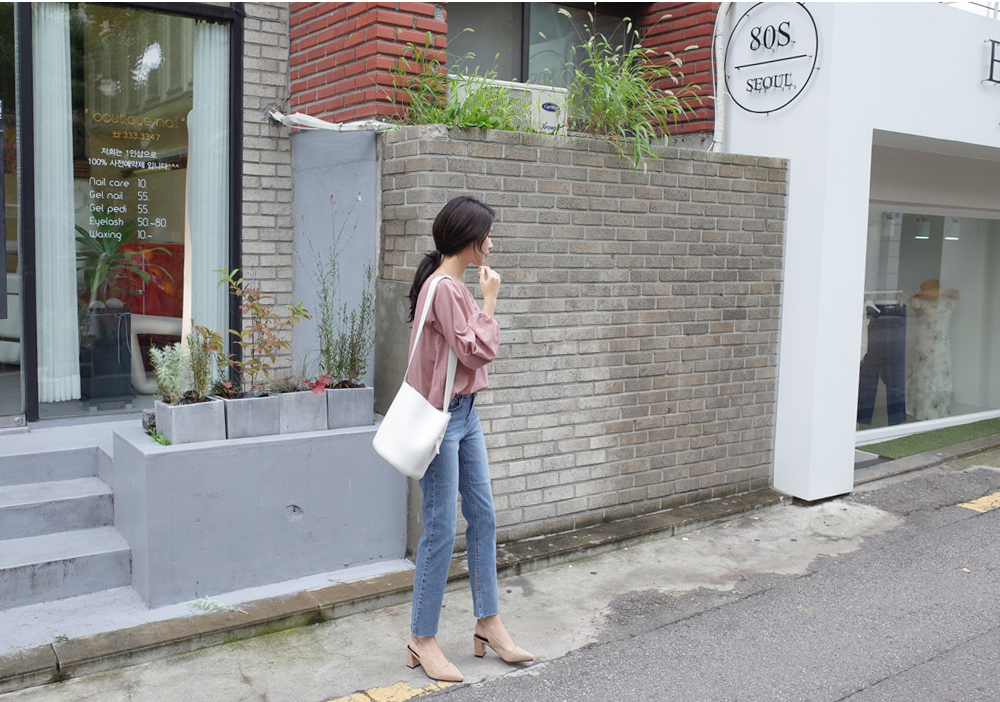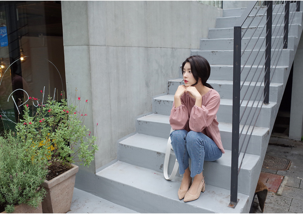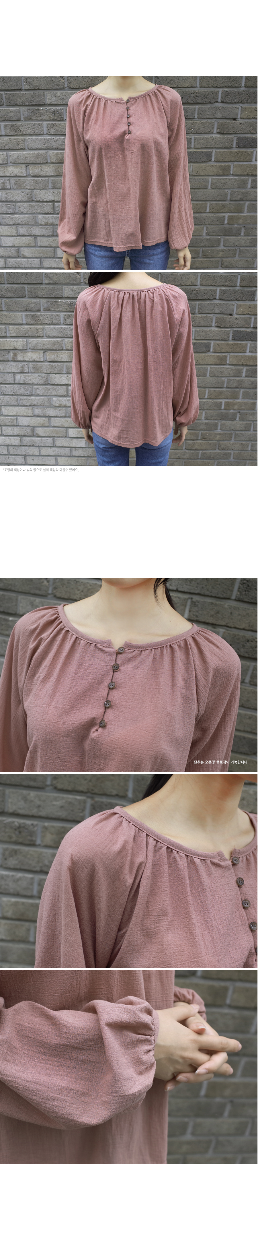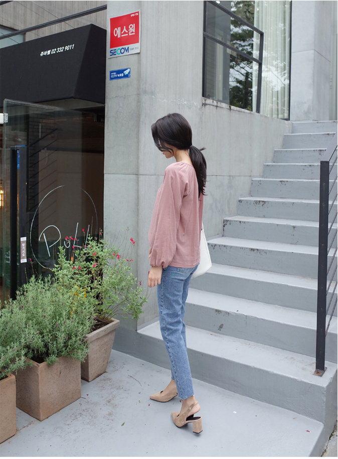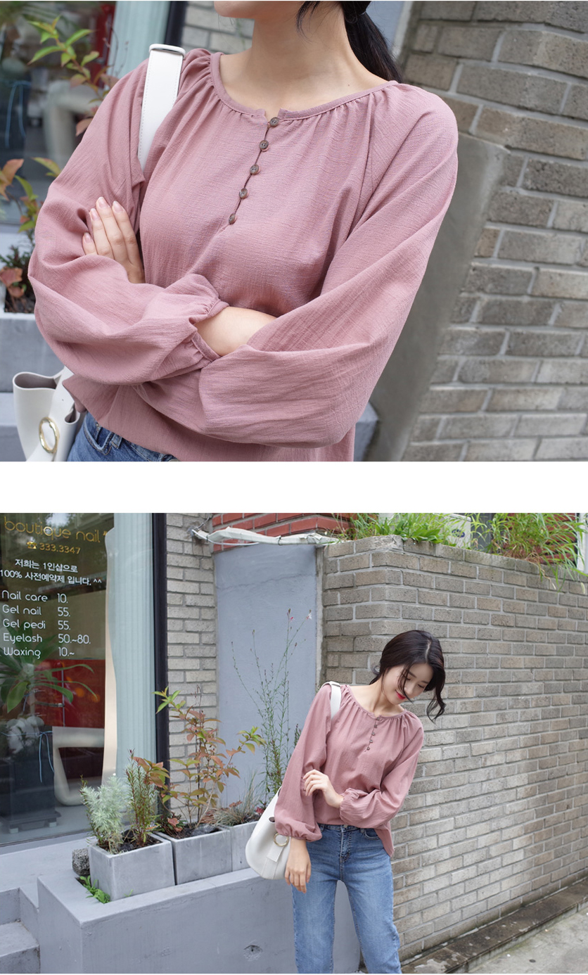 넥라인의 단추가 포인트가 되어주는 러블리한