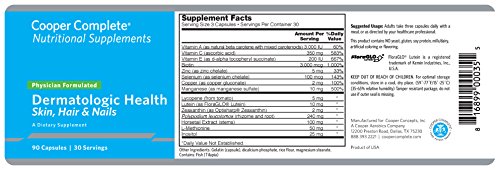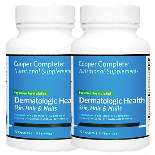 -. Feature : Dermatologic Health Skin Hair and Nails Supplement is suggested for adults. The daily recommended serving is three capsules daily with a meal. 90 capsules per bottle. 30-day supply. / Cooper Clinic Board Certified Dermatologists formulated Cooper Complete Dermatologic Health Skin Hair and Nails Supplement to provide key nutrients clinically proven to promote healthy skin, hair, and nails. / This product contains NO yeast, gluten, soy protein, milk/dairy, artificial coloring, or flavoring.