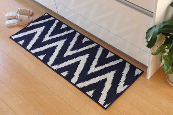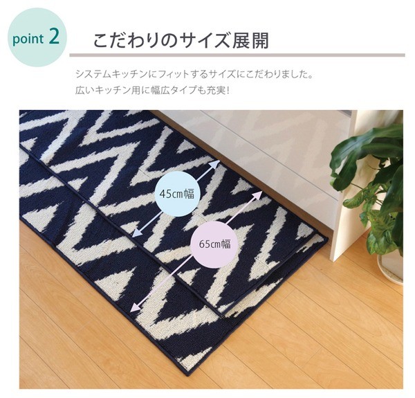 システムキッチンにも合いやすいサイズのキッチンマットです。通常タイプと幅広タイプの2種類をご用意しました。目付を上げることで弾力のある優しい踏み心地に仕上げました。コンパクトにも畳める商品なので収納も簡単です。汚れた際は洗濯機でも洗えるため清潔にご使用いただけます。(洗濯時はネットを使用してください)シンプルな幾何柄が特徴の商品です。