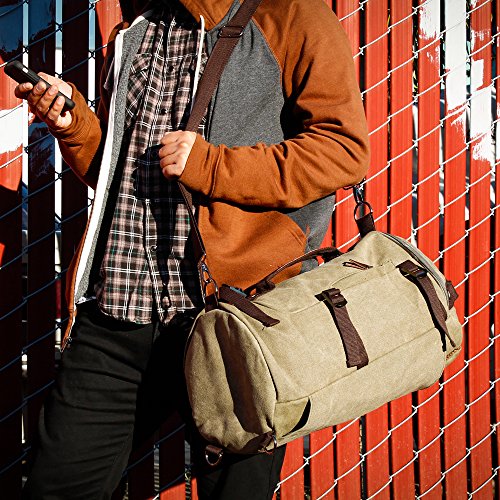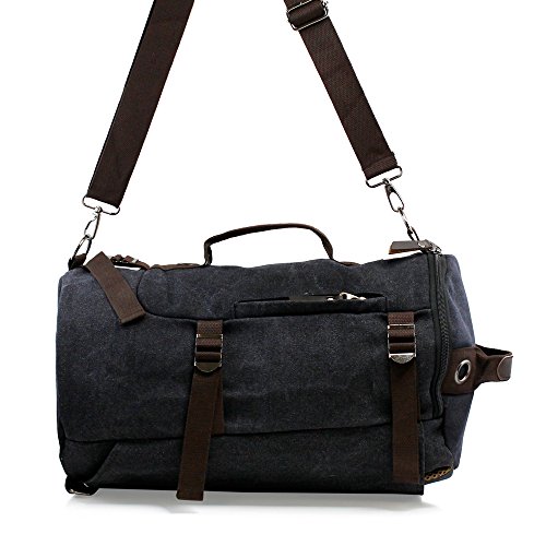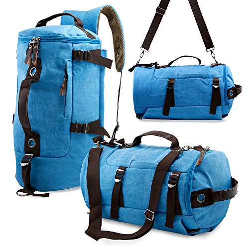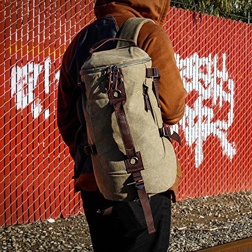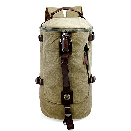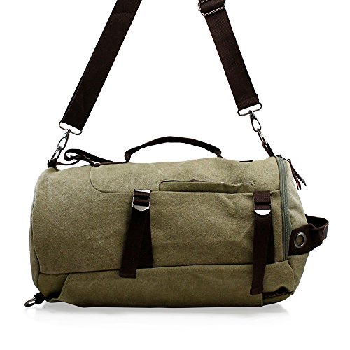 -. Feature : DESIGN & UTILITY - Made with high quality and durable canvas fabric material. Useful and practical for outdoor activities such as hiking, camping, backpacking, travel, or everyday occasions such as school, work, adventure, shopping, etc. / COMPARTMENTS - 1 zipper closure large spacious main compartment with 1 open and 1 zipper closure inner pockets to store your outdoor activity essentials and valuables securely. 1 front small zipper closure pocket for small accessories, and 1 large open pocket on the back for additional storage. / MULTI-FUNCTION - Can be used as backpack, messenger/shoulder bag, or duffel bag. Use the detachable and adjustable shoulder strap or grab the sturdy handle on the top or front to use as messenger/shoulder bag or duffel bag. Take out 2 padded and breathable shoulder straps from the large open pocket on the back and attach snap hooks to the attachment rings at the bottom to use as backpack. 5 adjustable compression straps and 2 more attachment rings on the sides and front / OVERALL DIMENSION - Backpack: approx. H15" x L9" x D8.5|CONTENTS & - Bag x 1, adjustable shoulder strap x 1 / Product of Oct17, Trademark Registered.