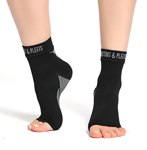 Buttons & Pleats Foot Compression Sleeves are revolutionary ankle sleeves with an open toe design to help you maintain a full range of motion. Our ankle socks feature graduated compression, squeezing the foot more or less across their length in key areas to promote circulation optimally. Our ankle support socks provide a number of benefits, including:
