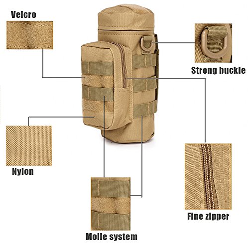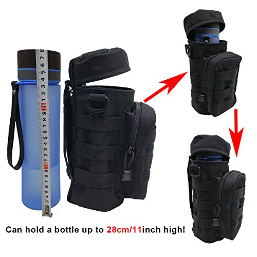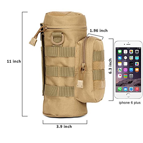 -. Feature : High Capacity H2O Hydration water pouch: One main zipper pouch can hold a bottle up to 11" high and 4" in diameter.Sturdy to carry large water bottle or heavy weight. Another zipper pocket can carry all sizes smart cell phones, navigator, portable battery, purse, key chain etd. / With Tactical Molle system water bottle carrier, convenient for you to hang other travel accessaries or small tactical bags, EDC pouches, tactical pens, flashlights, etd. The back molle webbing also perfect for hanging it on your tactical belt, tactical vest or military backpacks. igh and 4" in diameter.Sturdy to carry large water bottle or heavy weight. Another zipper pocket can carry all sizes smart cell phones, navigator, portable battery, purse, key chain etd. / Stylish and mordern military molle water bottle pouch, great application for your outdoor camping/hiking/running/riding/hunting / High quality 600D Polyester molle pouch , sturdy and durable, Unisex, waterproof and wear-resistance. / Lifetime guarantee and best 7/24 service for you. Don't like or any problem, 100% refund without worries.
