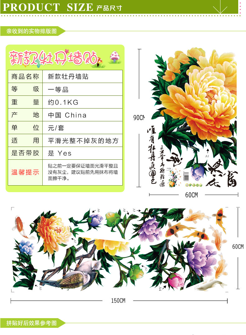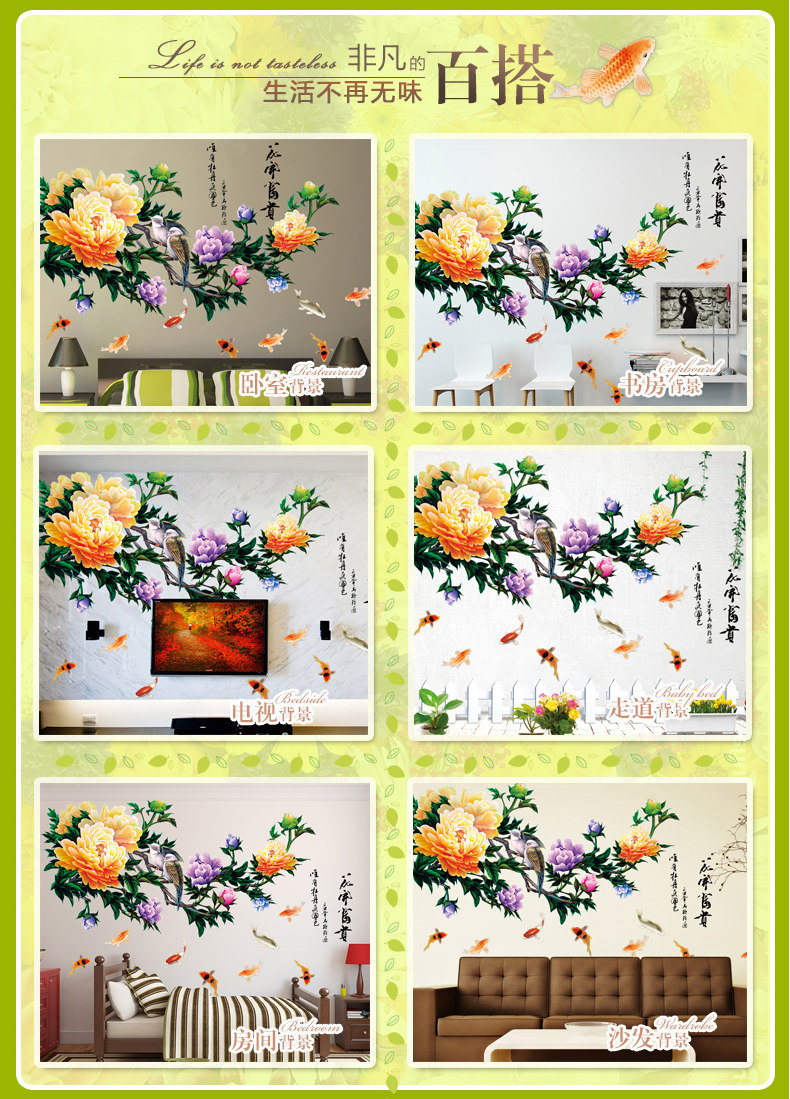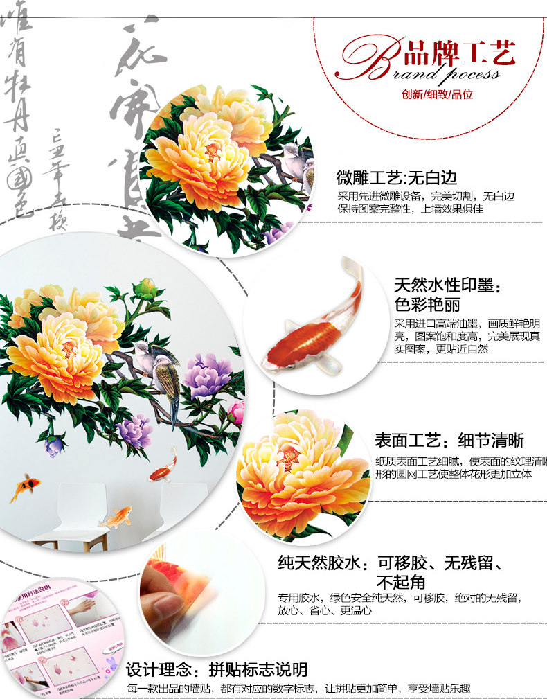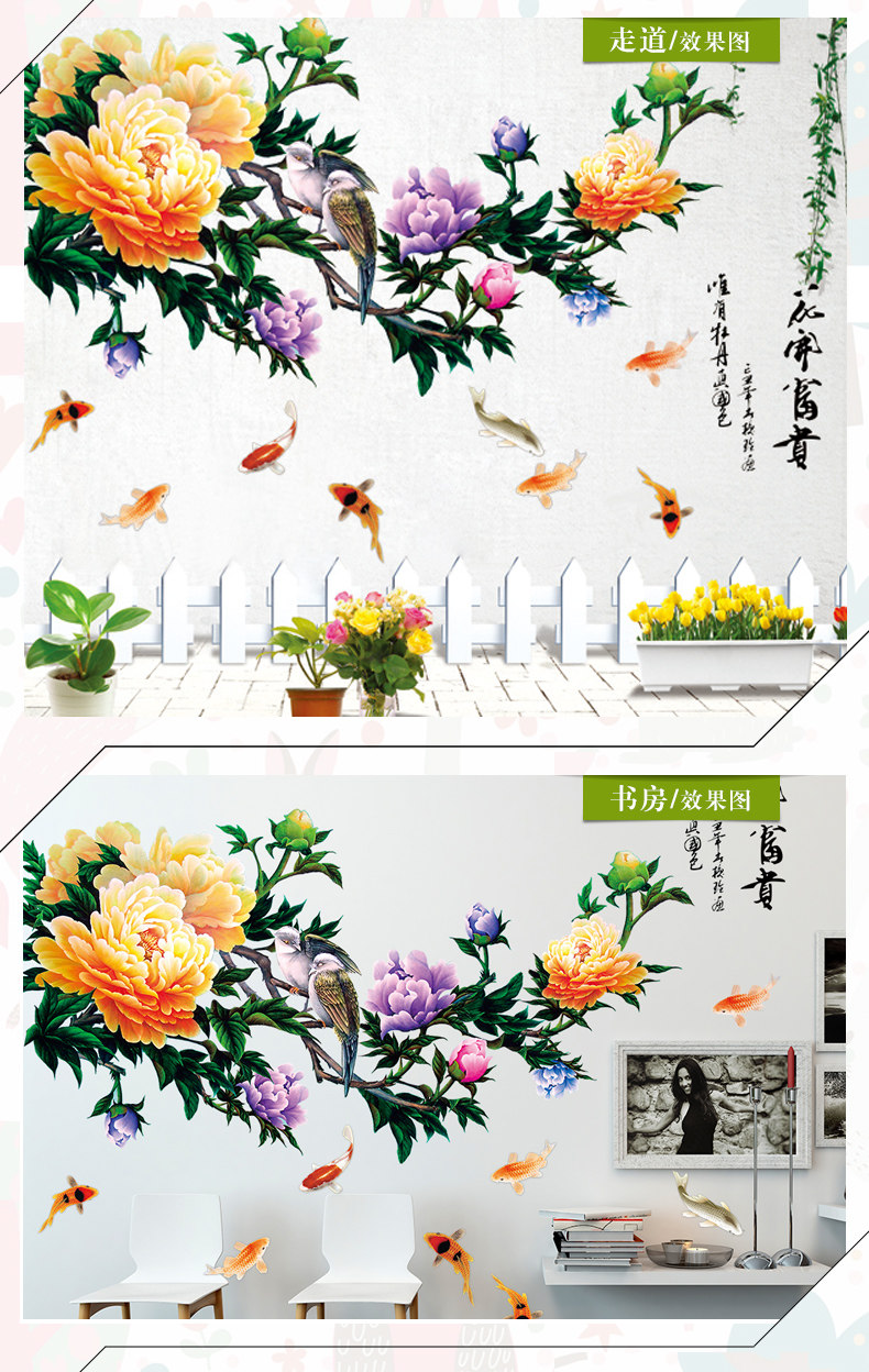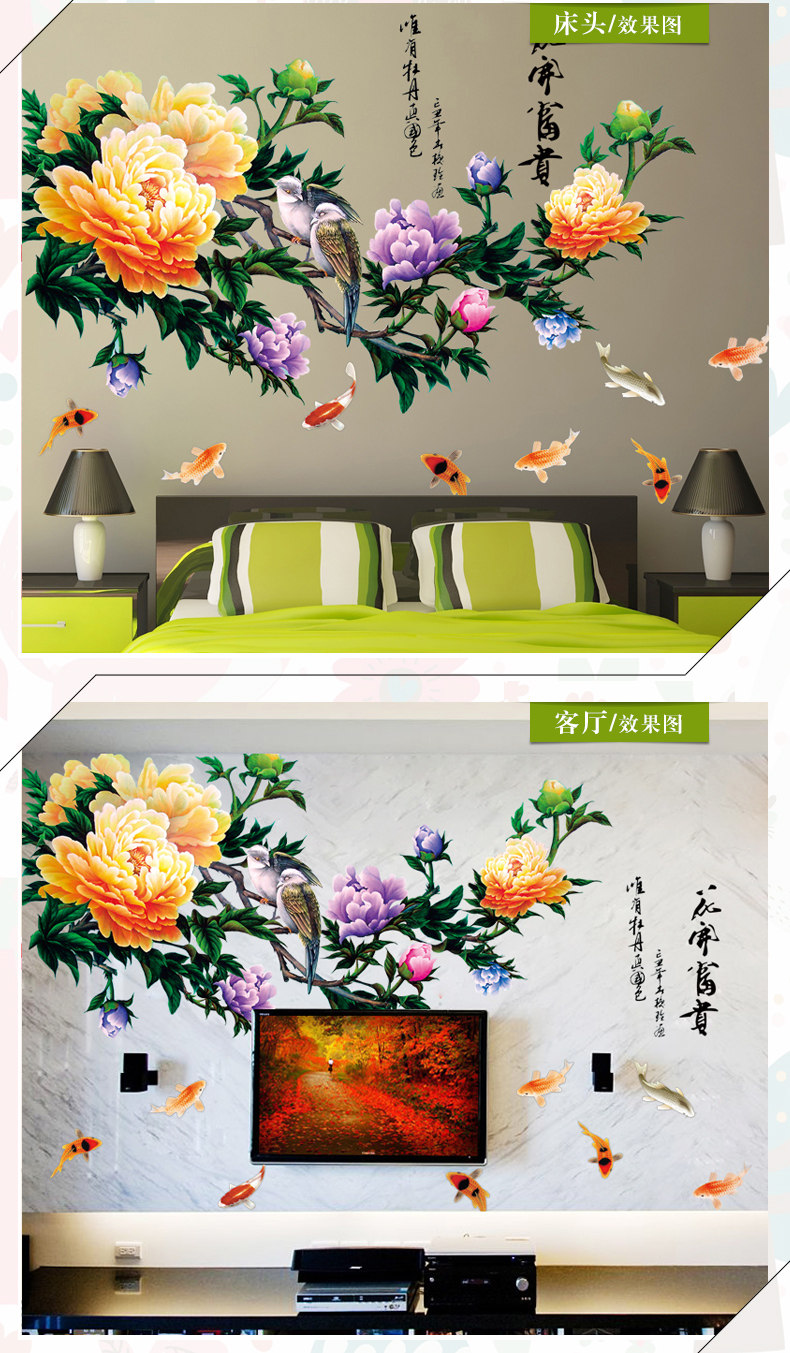 牡丹墙贴 花开盛世花贴卧室书房背景墙装饰贴纸环保可移除贴