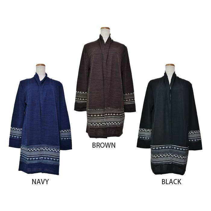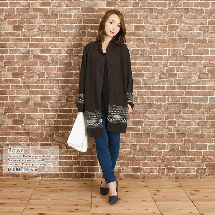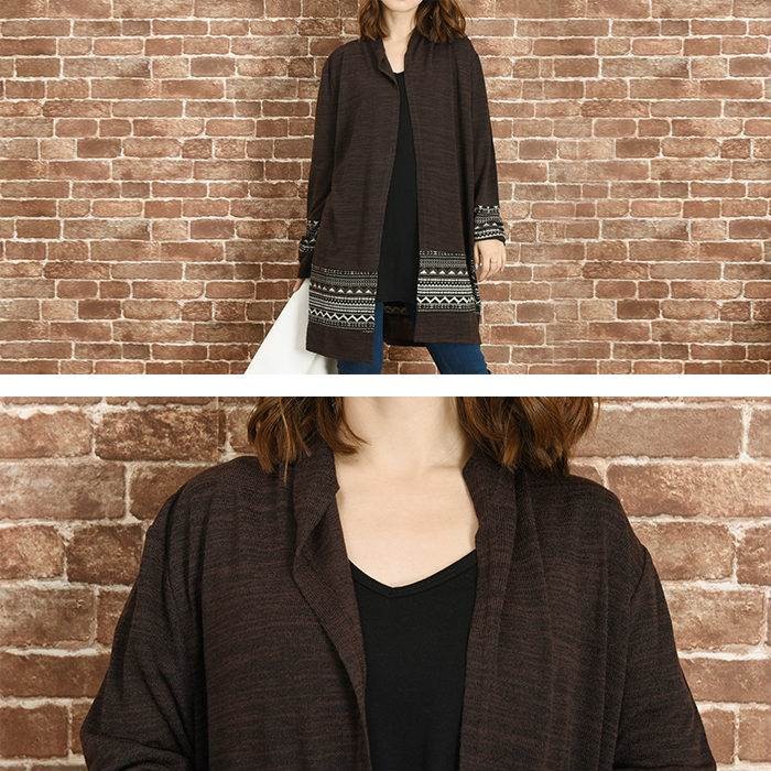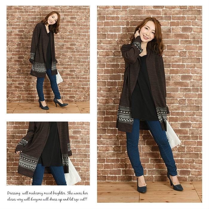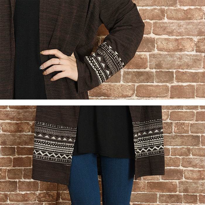 ●商品の特徴・ふんわりと暖かみのあるニットソー素材の無地生地に、袖口と裾口部分にオルティガ柄が切り替えになったデザインのカーディガンです。・さわり心地がふわふわで暖かく、オールシーズン使えます。・シンプルかつこなれ感のあるオシャレなデザインになっています。・ゆったりとしたシルエットでお尻がすっぽりと隠れる丈感なので、着心地楽ちんで幅広いコーディネートに着まわせること間違いなしです♪●サイズ展開 【M】 着丈84cm バスト79~87cm ウエスト64~70cm 【L】 着丈85cm バスト86~94cm ウエスト69~77cm●カラー展開 ネイビー ブラウン ブラック ※画像をご参照下さい。●商品詳細 【素材】:ポリエステル95% ポリウレタン5% 【厚み】:やや厚手 【裏地】:なし 【シルエット】:ゆったり 【伸縮性】:あり 【付属品】:なし (コーディネート使用の衣類、アクセサリー等は付属しません)20代 30代 40代 50代 人気 レディースファッション 大きいサイズ
