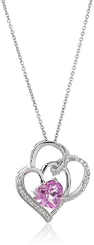 Sterling Silver Heart Shape Created Pink Sappphire with Round White Sapphire Double shape Heart Pendant Necklace, 18"