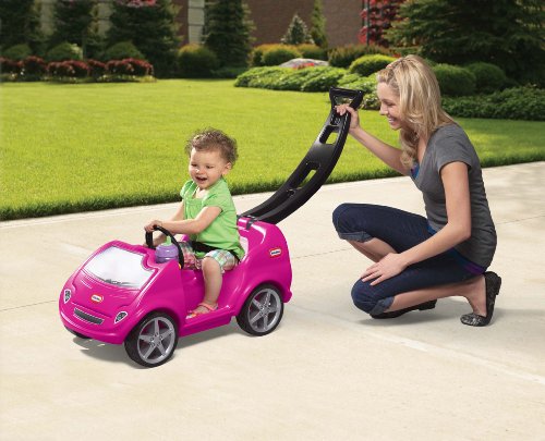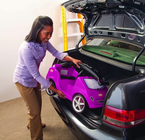 - Feature : Folding push handle locks into position / When folded, push handle creates a carry handle to lift the ride-on into a car trunk or storage / 2 cup holders: on in front for child and one in back for mom or dad / Large storage area under hood. Hood opens backward like a sports car! / Seat Belt. Ample seating and floor area. Quiet-ride tires; Made in USA