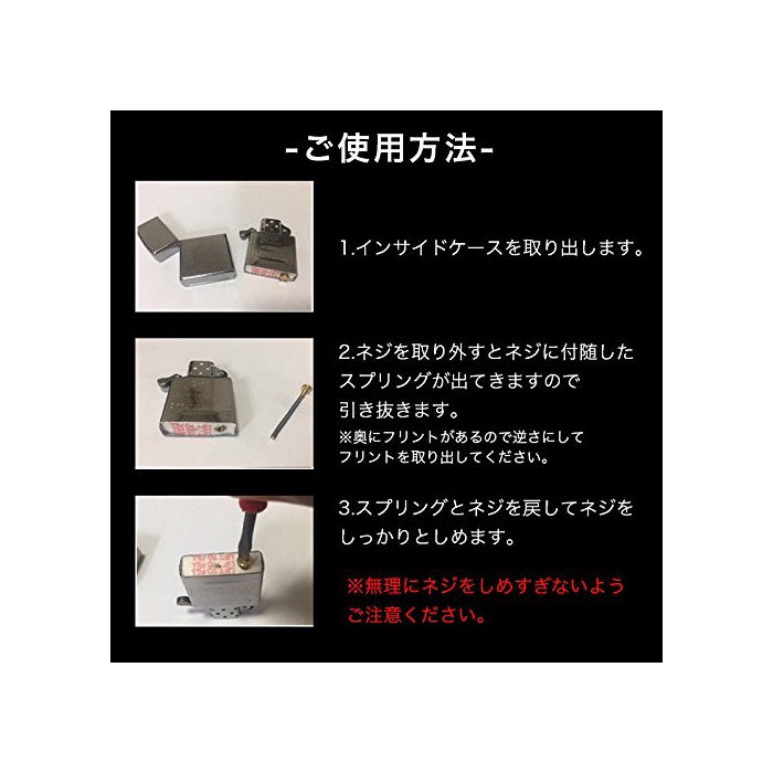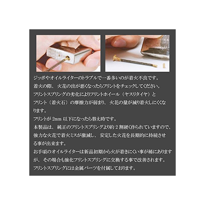 ZIPPO나 오일 라이터의 발화 불량의 원인이 되는 플린트 스프링의 열화(품질이나 성능 등이 나빠짐)를 해소 만듭니다.