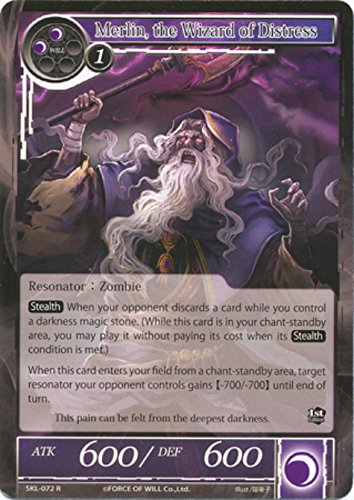 -. Binding : Toy -. Brand : Force Of Will -. EAN : 0740642682690 -. Feature : A single individual card from the force of will trading and collectible card game (tcg/ccg). / This is of rare rarity. / From the the seven kings of the lands set. -. IsAdultProduct : 0 -. Label : Force Of Will -. Manufacturer : Force Of Will -. ProductGroup : Toy -. ProductTypeName : TOYS_AND_GAMES -. Publisher : Force Of Will -. Studio : Force Of Will -. Title : Force of Will - Merlin, the Wizard of Distress - SKL-072 - Rare - The Seven Kings of the Lands -. UPC : 740642682690