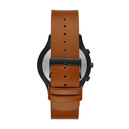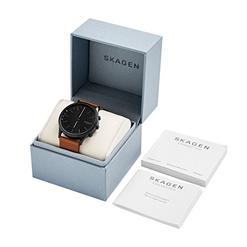 The Jorn Connected hybrid smartwatch combines innovative technology with classic design. Features include automatic time and date adjustment, activity and goal tracking, sleep tracking, filtered email and text notifications, dual-time function and SKAGEN LINK technology, which allows the wearer to snap a photo, control their music and more-all with the push of a button. Jorn Connected is compatible with Android phones and iPhone and syncs wirelessly to the SKAGEN app, where you can view your data and manage settings. The watch runs on a standard coin-cell battery with a four- to six-month battery life, so it never needs to be recharged. And the quick-release-pin construction makes it easy to interchange the leather band with other 22mm leather or steel-mesh straps.Feature