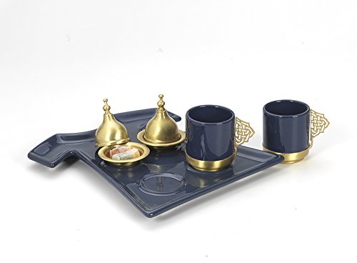 Product Description7 Piece Unique Oriental Ottoman Style Coffee Espresso Service SET for 2 (2 Porcelain cups with brass holders lids,1 Ottoman Caftan tray,2 sugar delight serving dish and 2 lid).?deal for excellent coffee serving.0