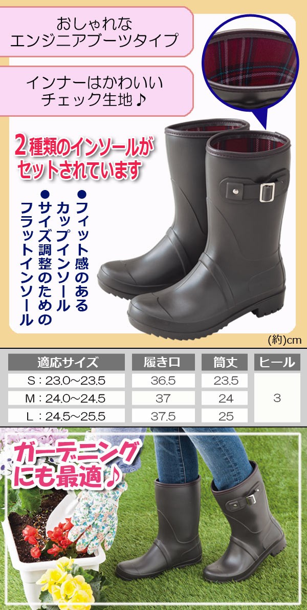 | おしゃれなエンジニアブーツタイプ。ゆったりサイズで、先端が少し上がったつまづきにくい設計。クッション性、フィット感をアップさせるインソール付き。雨の日のお出かけ、お買いもの、通勤時に。ガーデニング、アウトドアにも使えます!水や土、泥汚れが気になる時や、足元が悪い時などにおすすめです! |