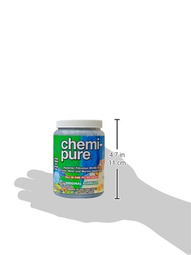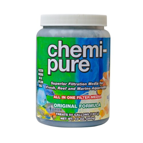 Chemi-pure is the original formula for over 50 years with millions of satisfied customers. It was invented by Dick Boyd in the 1960's. Chemi-pure combines high grade granular activated carbon with advanced ion exchange resins offering superior filtration for your freshwater, reef, or marine aquarium. Together, this proprietary blend removes odors and color- causing dissolved organic molecules along with toxins, medications, phenols, and dissolved metals. Chemi-pure's exclusive media formula has an ideal pore size for absorbing nitrogenous wastes and dissolved organics in your aquarium water while being the safest filter media available. Chemi-pure will keep your aquarium healthy, stable, and crystal clear. Keep Chemi-pure sealed in container until ready for use. Rinse lightly under running water then place nylon bag in any external power filter, canister filter, or filter sump. Chemi-pure should be replaced approximately every 3 months depending on bio-load. If more than one Chemi-pure filter bag is used, change one at a time every week until all bags have been replaced. Use one 10 oz. unit for up to 50 gallons.Feature