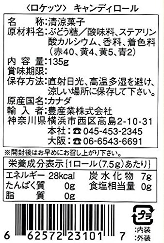 原材料:ぶどう糖/酸味料、ステアリン酸カルシウム、香料、着色料(赤40、黄4、黄5、青2)
