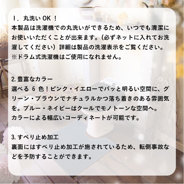 サイズ 約55×60cm 材質 パイル部/ポリエステル100% 原産国 中国 使用上のご注意 マットの裏面にはすべり止め加工が施されているので、 塩化ビニール系の床材で長時間使用するとすべり止め加工の成分が反応し、 床材が変色することがあります。 目安として1週間ごとに使用場所を移動したり、 床面をふいたりしますと変色が防げます。 ホットカーペットや床暖房など暖房器具の上での使用は、 変色やすべり止めの成分が溶着するおそれがありますので絶対におやめください