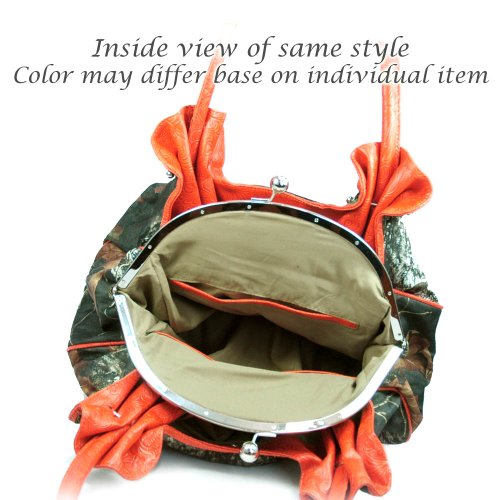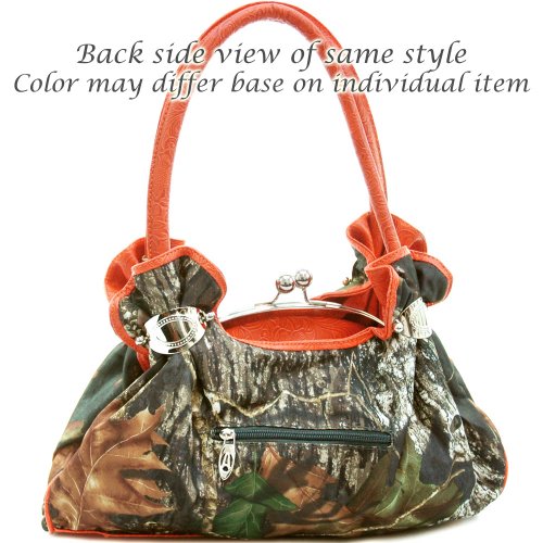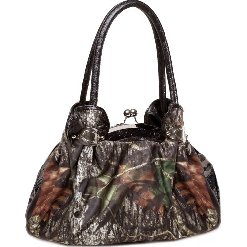 Product Description This camouflage shoulder bag features a curf accent on the shoulder handles. Kiss-lock closure for safety as well as beautiful decoration. A back zippered pocket provide extra room for small gadgets. Style: Shoulder Bag Construction: Simulated leather construction Exterior: waterproof fabric, camouflage pattern Entry: Kiss-lock closure Hardware: Silvertone Lining: Fabric lining Exterior pockets: One back zippered pocket Interior pockets: One (1) side pocket, One (1) cell phone pouch Bag dimensions: 16"W X 8.5"H X 6"D Strap Drop Length: Dual carry straps with 9" drop length 0