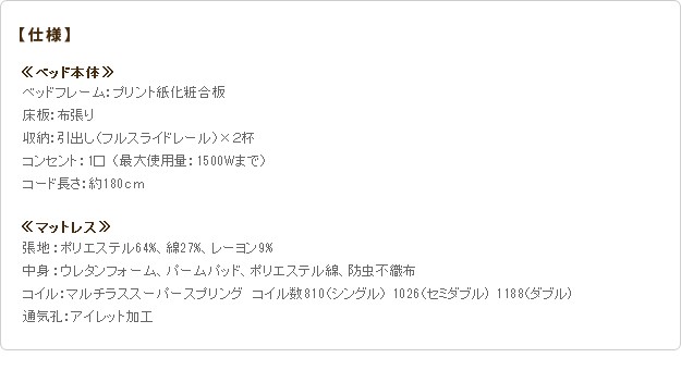 材質:[ベッド]本体-プリント紙化粧合板、コンセント-1口(1500W)、[マットレス]張地-ポリエステル64%・綿27%・レーヨン9%、中身-ウレタンフォーム・パームパッド・ポリエステル綿・防虫不織布、コイル-マルチラススーパースプリング・コイル数1026、通気孔-アイレット加工