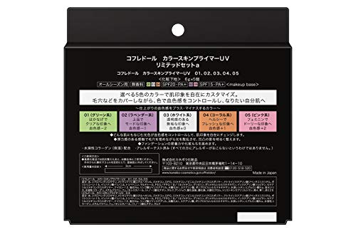 ■カラースキンプライマーUV 01、02、04、05 成分:水、シクロペンタシロキサン、メトキシケイヒ酸エチルヘキシル、ジメチコン、DPG、(ジメチコン/ビニルジメチコン)クロスポリマー、テトライソステアリン酸ジペンタエリスリチル、ポリシリコーン-15、イソノナン酸イソノニル、トリベヘニン、マルチトール、PEG/PPG-19/19ジメチコン、グリセリン、ポリメチルシルセスキオキサン、イソステアリン酸ソルビタン、セテアリルジメチコンクロスポリマー、ナイロン-12、塩化Na、リンゴ酸ジイソステアリル、水酸化Al、ステアリン酸、ポリプロピルシルセスキオキサン、水添レシチン、ヒアルロン酸Na、含水シリカ、水溶性コラーゲン、メチルパラベン、フェノキシエタノール、(+/-)酸化チタン、タルク、グンジョウ、酸化亜鉛、酸化鉄、水酸化クロム、トリエトキシカプリリルシラン、黄4、青1、赤226 ■カラースキンプライマーUV 03 成分:水、シクロペンタシロキサン、メトキシケイヒ酸エチルヘキシル、ジメチコン、DPG、(ジメチコン/ビニルジメチコン)クロスポリマー、テトライソステアリン酸ジペンタエリスリチル、ポリシリコーン-15、イソノナン酸イソノニル、トリベヘニン、マルチトール、PEG/PPG-19/19ジメチコン、グリセリン、ポリメチルシルセスキオキサン、イソステアリン酸ソルビタン、セテアリルジメチコンクロスポリマー、ナイロン-12、塩化Na、リンゴ酸ジイソステアリル、水酸化Al、ステアリン酸、ポリプロピルシルセスキオキサン、水添レシチン、ヒアルロン酸Na、水溶性コラーゲン、メチルパラベン、フェノキシエタノール、(+/-)酸化チタン、タルク