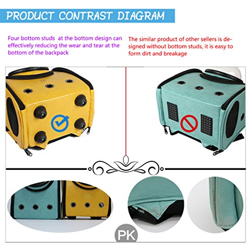 -. Feature : Perfect for pet dog/cat up to 11lb, eco-friendly casual life style. / Four bottom studs at the bottom design can effectively reducing the wear and tear at the bottom of the backpack / Built-In security leash, mesh panels & ventilation holes, soft washable pad, top & side entries for maximum accessibility. / Semi-sphere window design. Small pets, such as small cats and dogs can be easy to keep in carriers. / Practically designed, satchels, and bags are great for keeping your furry friend with you on all your adventures.