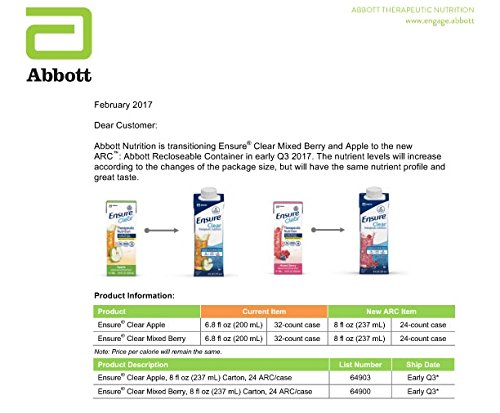 Studio : Ensure Clear Publisher : Ensure Clear Binding : Health and Beauty Product Description Manufacturer # 64900 Brand Ensure Clear Manufacturer Abbott Nutrition Application Oral Supplement Container Size 8 oz. Container Type Recloseable Tetra Carton Flavor Mixed Berry NDC Number 70074064899 Preparation Ready to Use Storage Requirements USP Controlled Room Temperature UNSPSC Code 42231801 Features ENSURE CLEAR is a great-tasting, clear liquid nutrition drink that contains high-quality protein and essential nutrients. ENSURE CLEAR is fat-free, making it an ideal choice for patients on clear-liquid, pre- and post-surgical, bowel prep, fat-malabsorptive, and fat-restricted diets. It is also ideal for patients who prefer a fruit-flavored alternative to creamy shake-like supplements. ENSURE CLEAR can benefit patients who have malnutrition, are at nutritional risk, or are experiencing involuntary weight loss. Ensure Clear is a great tasting alternative to creamy nutritional supplements Provides the additional calories, protein, vitamins and minerals that you need with a refreshing taste you'll love Good source of 19 essential vitamins and minerals Gluten free Case of 24 - 8 Ounce Cartons Replaces 6.8 Ounce Cartons - Discontinued by manufacturer 0