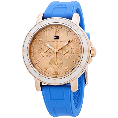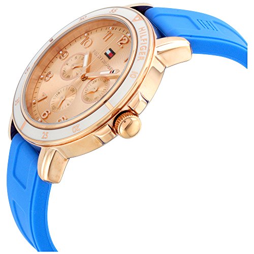 Rose gold tone stainless steel case with a blue silicone strap. Rose gold tone dial with rose gold-tone hands and Arabic numeral hour markers. Minute markers around the outer rim. Dial Type: Analog. Date display at the 3 o'clock position. Three- date, day of the week, and 24 hours. Quartz movement. Scratch resistant mineral crystal. Pull / push crown. Solid case back. Case size: 40 mm. Case thickness: 10 mm. Round case shape. Band width: 16 mm. Buckle clasp. Water resistant at 30 meters / 100 feet. Functions: date, day, hour, minute, second. Sport watch style. Tommy Hilfiger Tara Ladies Watch 1781512.