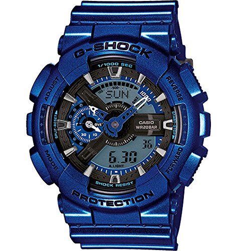 This new model dresses up the big case GA-100 in bold metallic blue hue which is part of today's summer street fashions. Face, the small hand, and the large hand are done in a single base color, while the tips of all hands are white for easy reading.Feature