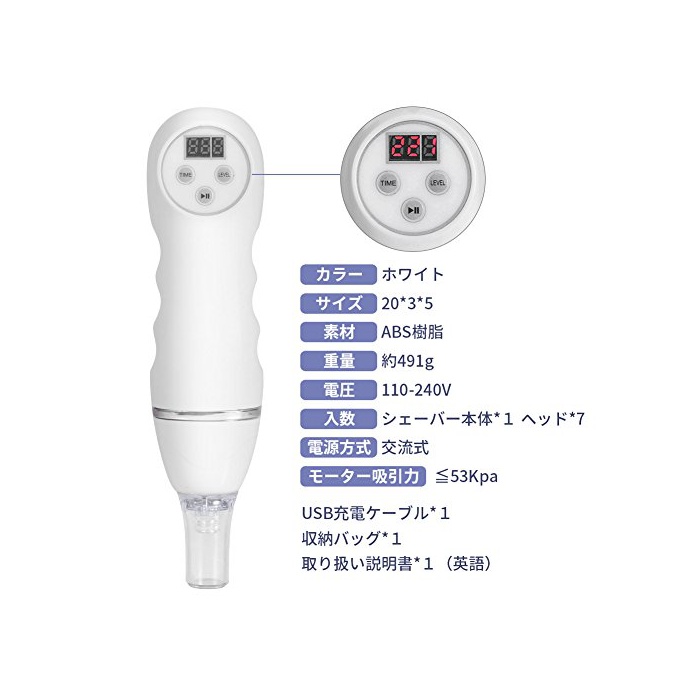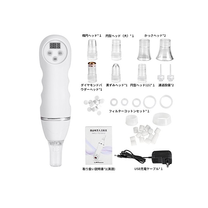 【팩키지 내용】사이즈:20*3*5.컬러:화이트.모공 흡인기 본체*1,다이아몬드 파우더 헤드*1,삼 헤드*2,검은 얼룩 헤드*1,엔형 헤드(대)*1,엔형 헤드(소)*1,타원 헤드*1,여과 설비*2,필터 코튼*1.수납 가방*1.USB충전 케이블*1.취급 설명서*1(영어).고객은 뭔가 문제가 좌지금 하면,부담없이 메일에 스탭에 문의해 주십시오