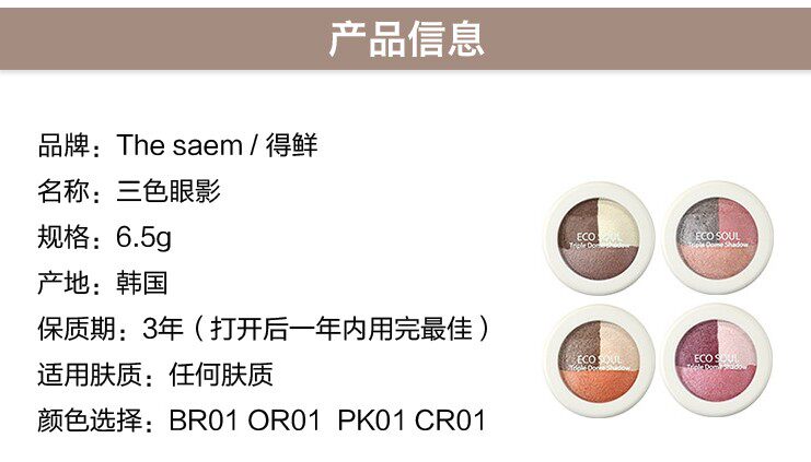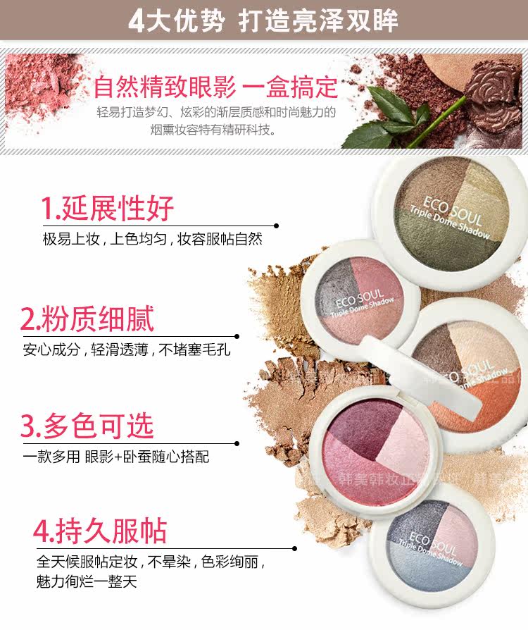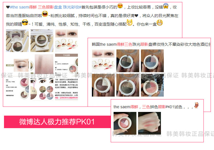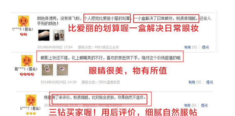 得鲜三色眼影,截至2016年6月7日热销12000多单了,得到了99.9%的客人的赞美和肯定,但是也有0.01%的客人说不容易上色,韩美有必要在这里解释一下,对于新手和不会化妆的菇凉来说肯定有点难度啦,建议多百度看看化妆眼影的视频喔!多练练就可以达到好的效果喔!