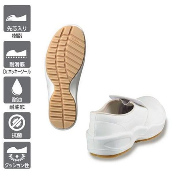 耐滑性バツグン!!油にも強いスニーカータイプの厨房靴です。クッション性にも優れている、疲れにくいタイプ。つま先部分を保護する先芯入りです。抗菌加工をした人工皮革素材を使用しています。