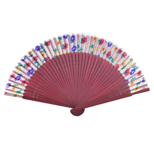 Bamboo Folding Fan - Colorful Floral Design in White - Red