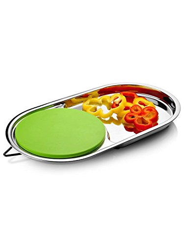 -. Feature : 100 % Brand new and High Quality / Package contains one stainless steel capsule shape vegetable chopper / Portable, stack-able and dishwasher safe / Unit measures 14.5(Length) X 8 (Width) X 1.5 (Height) inches, Round cutting board diameter is 6.5 inches