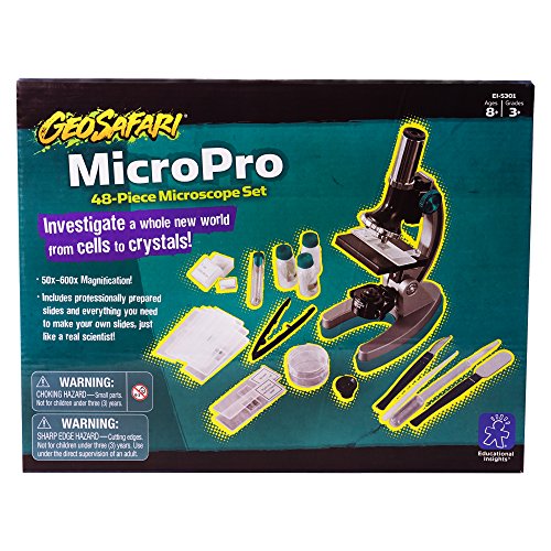 With the GeoSafari MicroPro, young scientists can investigate everything from cells to crystals. Perfect for individual or classroom use, the glass eyepieces and power settings from 50x to 600x provide users with superior precision viewing. The built-in light and rack-and-pinion focusing help deliver bright, clear images. The 48-piece kit has professionally prepared slides and everything users need to make their own specimen slides. Not a toy, but a scientific instrument, the microscope includes high-quality components and features that make it appropriate for science learning at any age. Requires 2 AA batteries for light (not included).