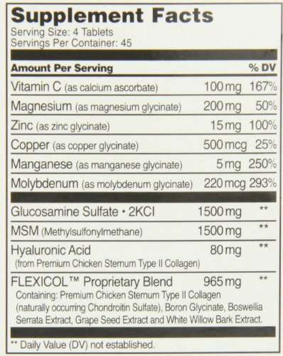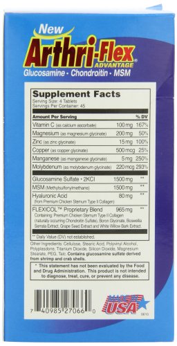 21st Century ArthriFlex 180 Tab combines Glucosamine Sulfate, naturally occurring Chondroitin Sulfate and MSM with FLEXICOL™ which is formulated to offer a long term solution to improve the basic structure and function of joints and cartilage. Taken dailyArthri-Flex® with FLEXICOL™, will nourish cartilage and lubricate joints to improve flexibility, comfort and range of motion. For best results, take four (4) tablets daily, two (2) in the morning and two (2) in the afternoon, preferably with meals, or as directed by a healthcare provider. Do not exceed recommended dosage.Feature