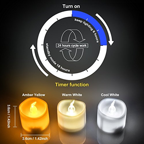 - Timer Function: All LED Tea Lights With Timer Function, Turn It On, It Lights Up for 6 Hours and Then Turns Off for 18 Hours In 24 Hour Cycle Automatically, They Come On at The Same Time Every Day Like Clockwork, Save the Trouble to Turn It On and Off Every Day, and Give the Room a Nice Warm, Inviting Glow.