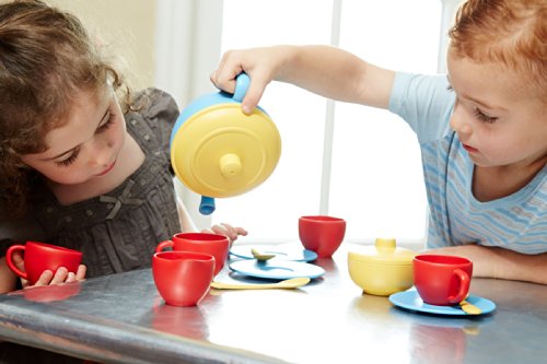 Jetzt steht der Kinder-Teeparty nichts mehr im Weg! 17-teiliges Service für 4 Personen. 4 Tassen (Ø 5,5 cm), 4 Unterteller, 4 Löffel, Milchkännchen, Zuckerdose und Teekanne (Ø 11 cm). Aus receyceltem Kunststoff, spülmaschinegeeignet.Feature