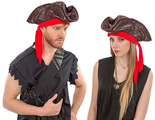 -. Feature : Brown Leatherette Tri-fold Pirate Costume Accessory Hat / Measures approx 16.5 / One size Fits most older children and adults / Made out of 100% polyester / Pirate Hat Includes Red removable Cloth Ribbon
