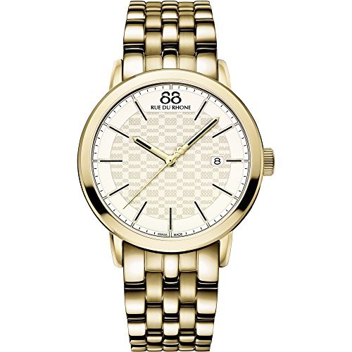The luxurious 88 RUE DU RHONE 87WA154203 Yellow Gold PVD Men's Watch is a beautiful watch from the 88 RUE DU RHONE Double 8 Origin collection. Its case is made of stainless steel case with Yellow Gold PVD treatment and RUE DU RHONE engraving. Fitted with a stainless steel, Yellow PVD crown with an 88 monogram, this Sapphire crystal watch showcases the luxury and sophistication that 88 Rue Du Rhone watches are popular for. The round 42mm case watch is secured with a stainless steel, Yellow Gold PVD bracelet with a folding deployment clasp for a better fit around your wrist bringing an understated stylishness to your watch. Additionally, this watch has a Swiss-Quartz movement and Champagne dial featuring 8-filigree motif and Black indexes for a bold and masculine look. What's more, the beautiful men's watch has a Yellow Gold PVD seconds hand with an 8-shaped counterweight and a date window at the 3 o'clock mark. It has a snapped case back with engraved logo and 8 engraved 8-shaped hour markers. With a water resistance of up to 165 feet, the watch is suitable for use playing water sports and swimming in shallow water.Feature