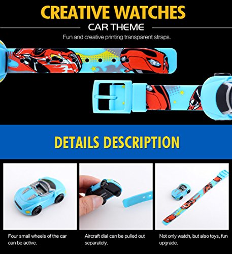 1.Be Interesting: It is a watch as well as a toy; the dial can be pulled out and separated from the watchband; after being pulled out, the dial become a manoeuvrable car with 4 rotatable wheels.