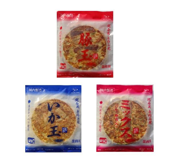 冷凍なのに焼きたての香ばしさが自慢の、豚玉&いか玉&ミックス焼のお好み焼セットです。サクサクしたキャベツの食感、ふっくらとした生地質をお楽しみ下さい♪ |